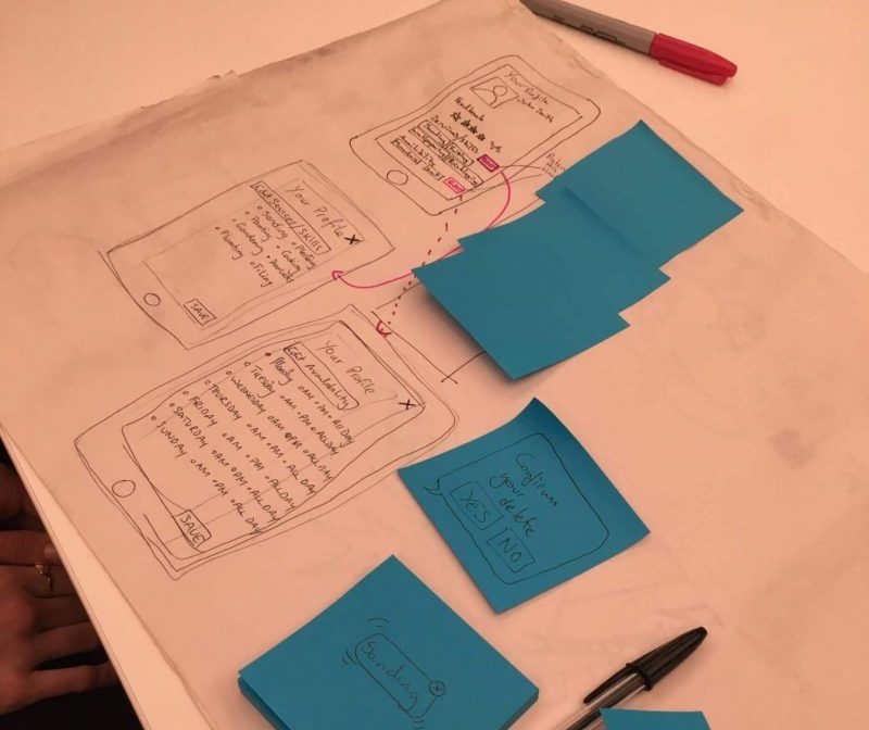 The first activity of the night was to map out our user’s Journey using the storyboards and personas we had created from previous weeks. Quickly noting down all the activities our users would go through from initial problem to using our application. A great activity that really allowed us to dig into the detail of every process of our product. Then mapping out subtasks under the initial notes and then creating our User Flows, discussing as teams how the users would move around the activities and subtasks.