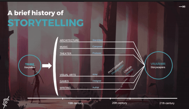 Mallet began by relaying some of the most fascinating projects that had already been carried out in this space – VR spin-offs of popular TV shows, VR sports video games and paintings coming to life, to name a few. Mallet boldly states, “VR is user experience. Welcome to the story-world!” and supports his position on the role of the virtual in our future stories by quoting Chris Milk, a pioneer in production for VR and an immersive artist in this field.